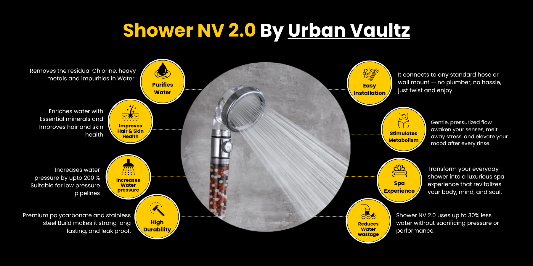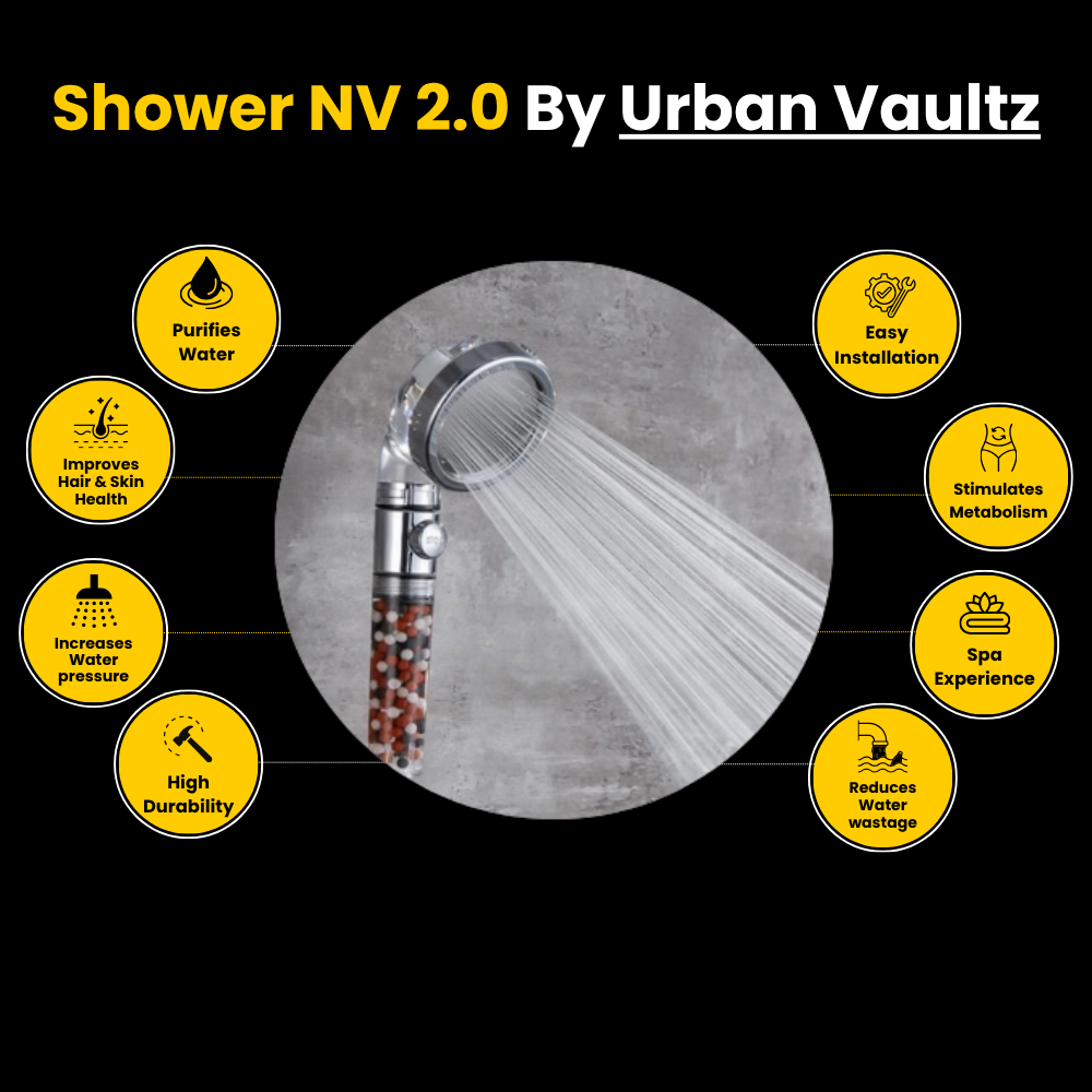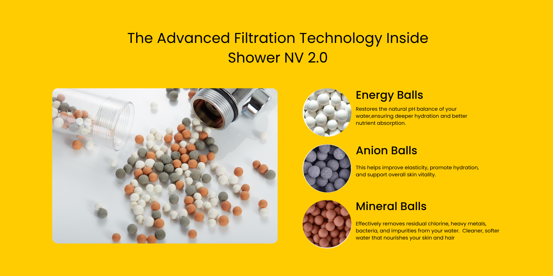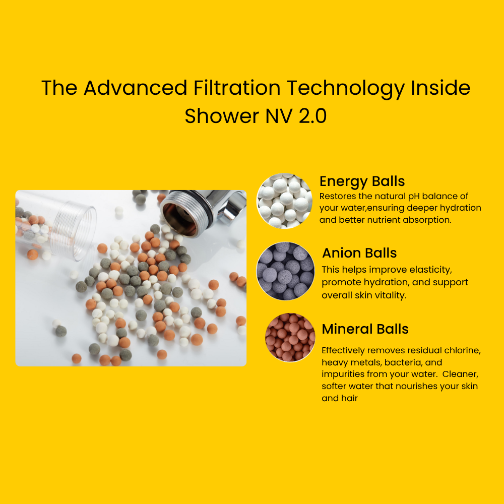 With Shower NV 2.0, every drop of water is purified, softened, and enriched with skin-loving minerals giving you smoother skin, shinier hair, and a fresh glow that lasts all day.